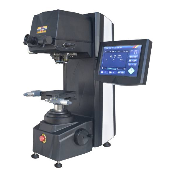 Our digital Vickers hardness tester offers precision and efficiency in hardness testing. Built with a sturdy aluminum alloy die-cast body, it combines durability with a sleek design. The direct-drive loading mechanism ensures stable force application, enhancing the accuracy and efficiency of testing procedures. The intuitive touchscreen interface provides clear, real-time display of essential metrics such as test force, indentation length, dwell time, conversion scales, and more.